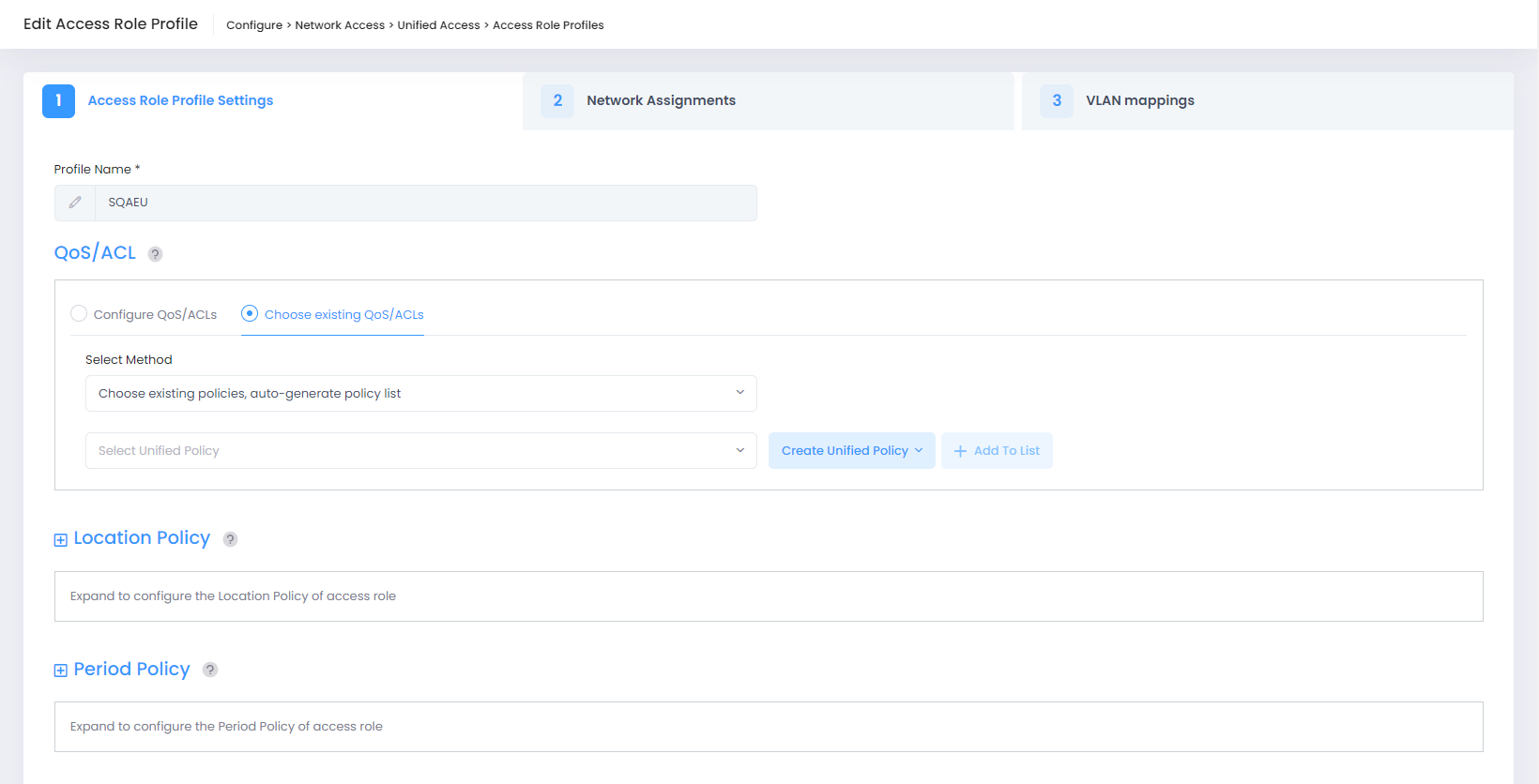 Configure QoS/ACLs - Select this option to define a QoS Policy for the Access Role Profile. You can then customize the policy settings to define conditions/actions for the QoS policy by clicking on Add more QoS/ACL tab. Define the basic information and then define at least one condition to assign a QoS policy list. For more information regarding defining the various conditions, visit Unified Policies Online help.