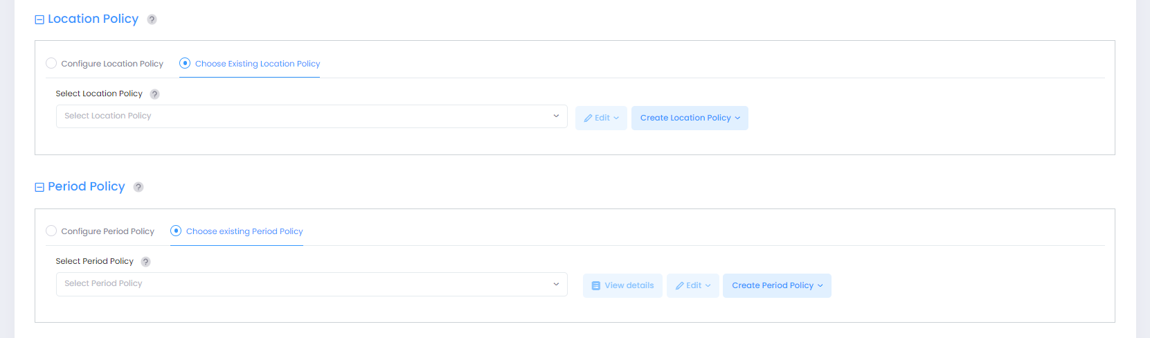 Choose Existing Location Policy - Select an existing Location Policy from the drop-down menu or click on Create Location Policy to open the Create Location Policy screen and create a new Location Policy. You can also click on Edit to open the Edit Location Policy screen and make changes to the selected policy.