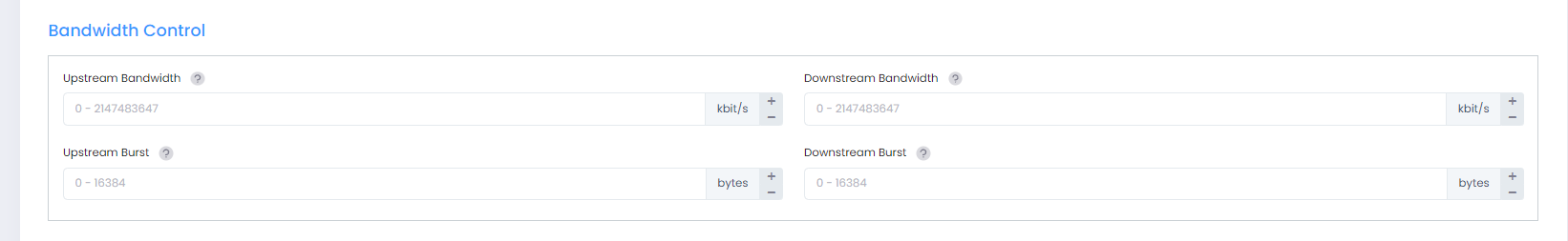 Downstream Bandwidth - The maximum bandwidth limit allocated for egress traffic assigned to the profile. If the maximum egress bandwidth value is set to zero, all egress traffic is allowed.