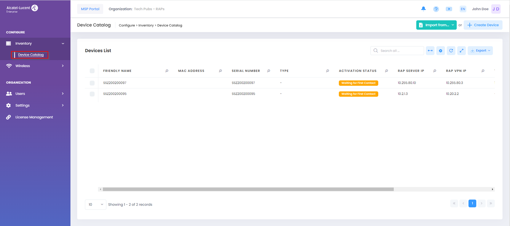Once the Import template is complete, click on Import. The Device Catalog list for the RAP Organization is populated with the imported AP devices.