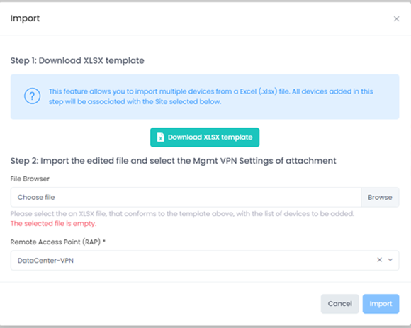 To import devices from an existing Excel sheet (.xlxs), click on Import from… and select XLSX template file. You will then be prompted to download an XLSX template file that contains instructions on how to configure the Excel file with the necessary device information.