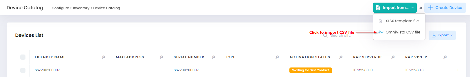 To import devices from an existing OmniVista .csv file, click on Import from… and select OmniVista CSV file. You will then be prompted to download a CSV template file that contains instructions on how to fill out the template with the necessary device information.