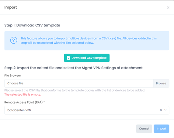 Fill out the template with information for each device that is to be imported. Once the file is complete and saved, return to Step 2 on the Import form and complete the following fields: