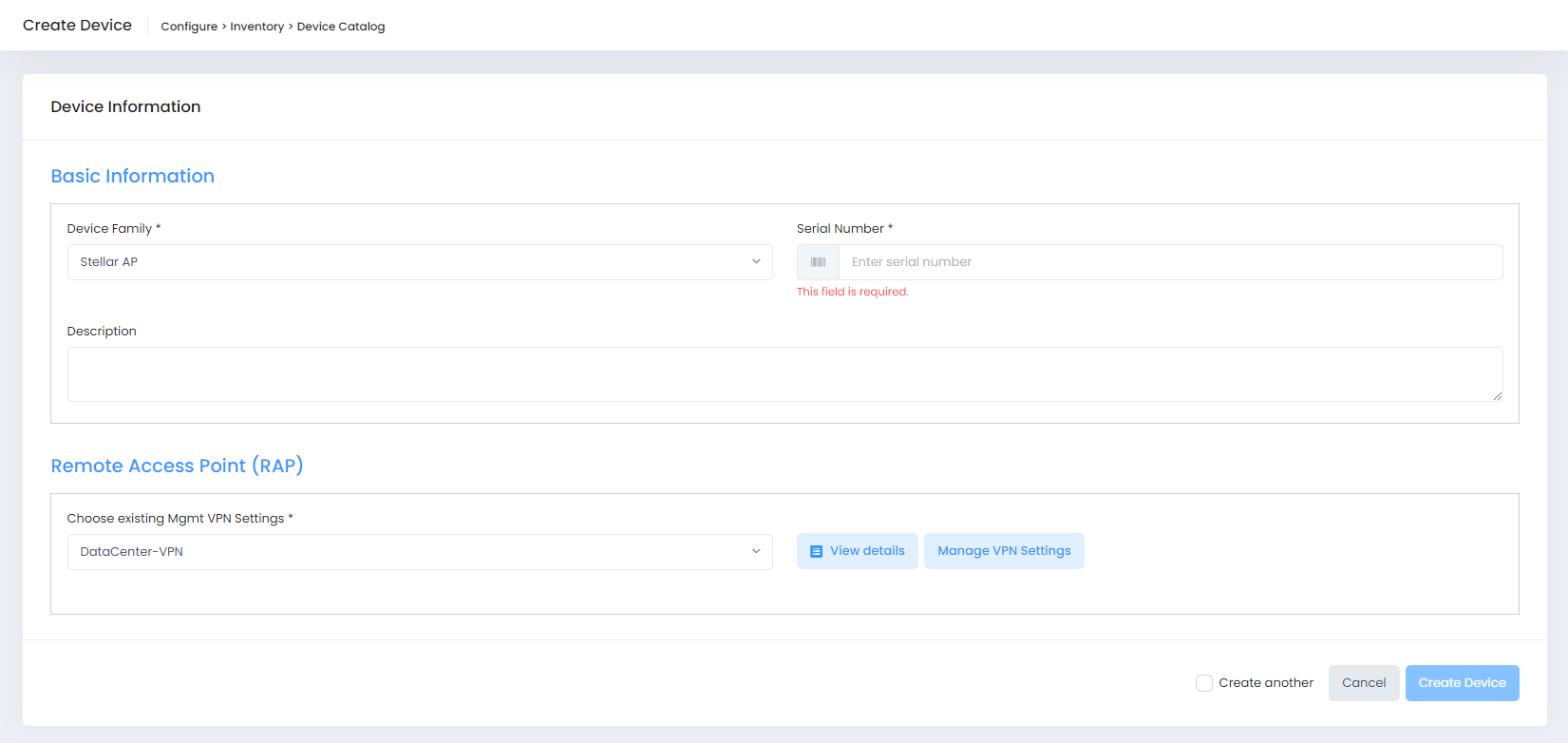 Click on Create another to return to the Create Device form to fill out for another device. If this box is not checked, the display returns to the Device Catalog screen.