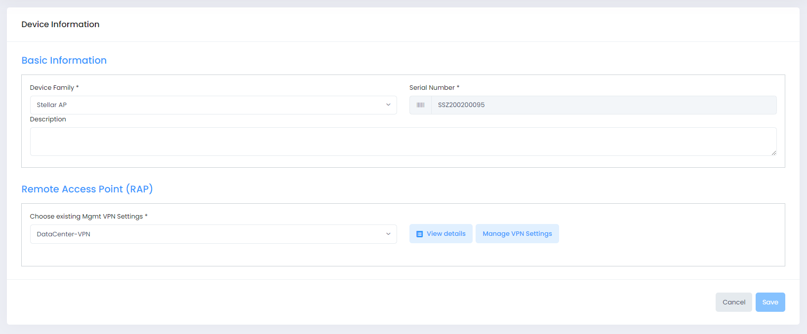 Choose existing Mgmt VPN Settings - Click on this field to select an existing Management VPN Tunnel to assign to the RAP device. You can also click on View Details to view information about the selected VPN Tunnel or click on Manage VPN Settings to open the Mgmt VPN Settings screen to make changes.