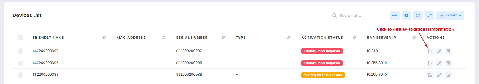 Click the icon in the “Actions” column next to a device entry to display the Device Information screen. The information displayed on this screen is defined below.