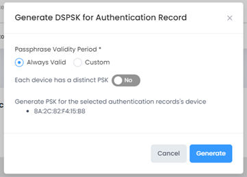 Select the Passphrase Validity Period (Always Valid or Custom) and whether each device will have a distinct PSK, then click on Generate. The device(s) associated with the record(s) will be added to the Company Property List as Device Specific PSK Devices. The PSK Passphrase for the device(s) is automatically generated by OmniVista Cirrus based on the device MAC Address and Session Time. The PSK Passphrase can be obtained and printed from the Company Property Screen. You can generate a PSK for any Authentication Record. See the Company Property online help for more information.