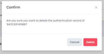 Click Delete on the following confirmation prompt. Note that when you delete an Authentication Record, you are logging the user associated with that record out of the network.