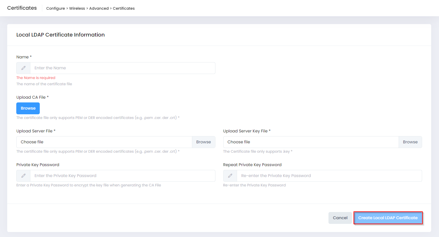 Complete the fields as described below, then click on Create Local LDAP Certificate when you are finished uploading the certificate.