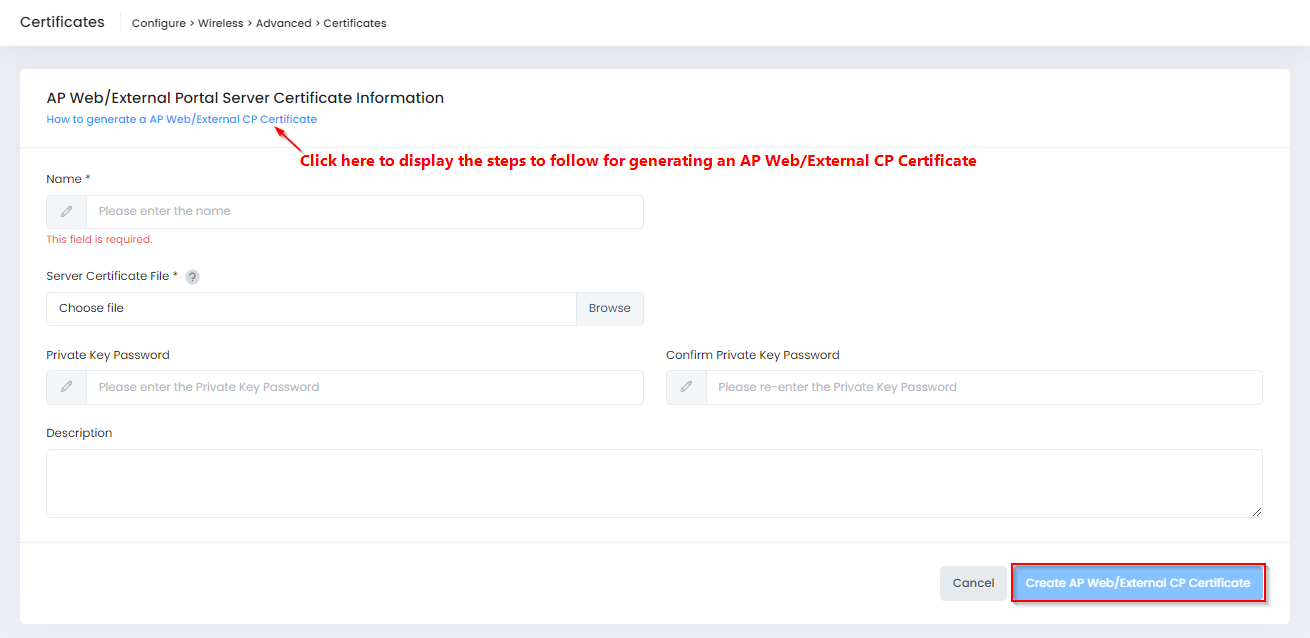 Complete the fields as described below, then click on Create AP Web/External Portal Server Certificate when you are finished creating/uploading the certificate.