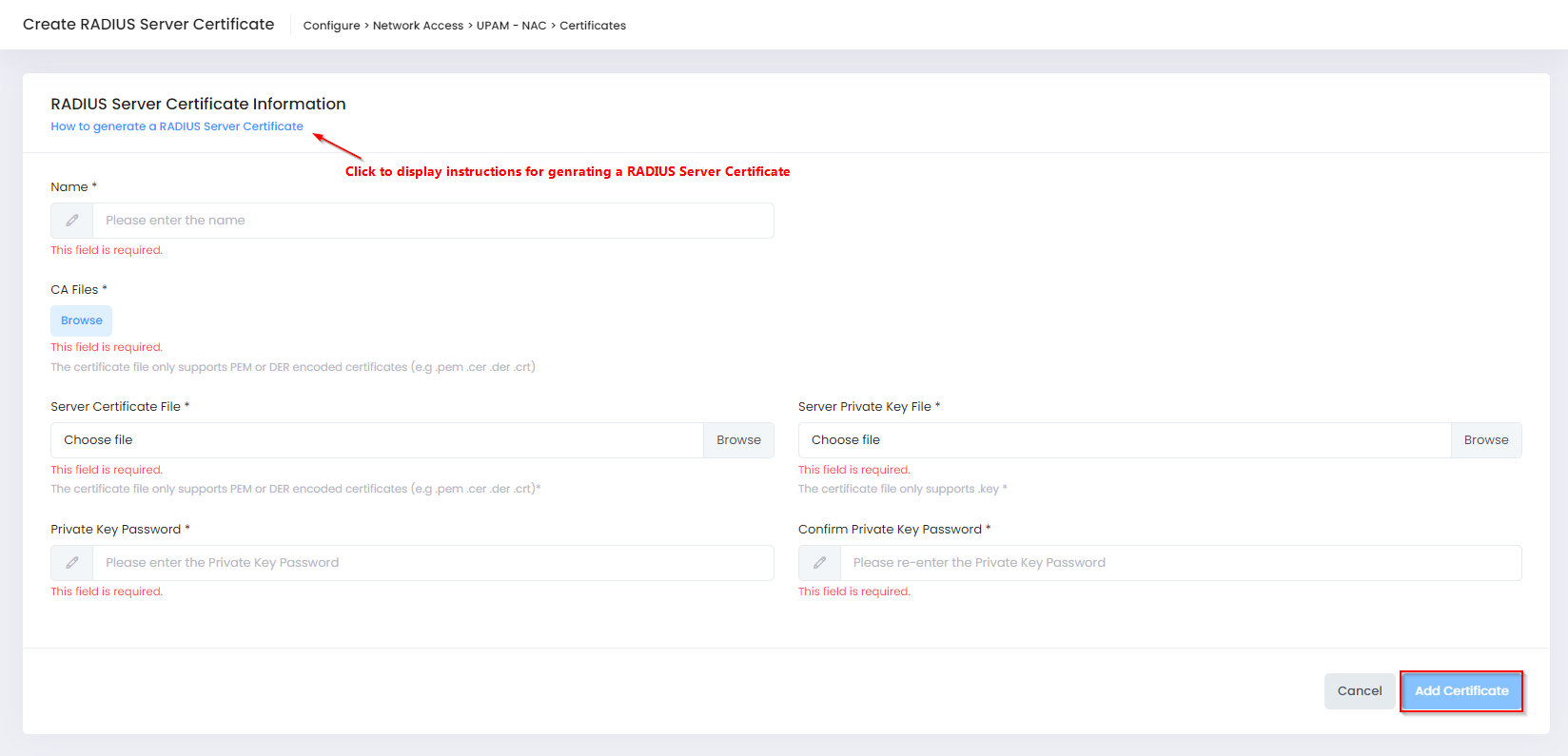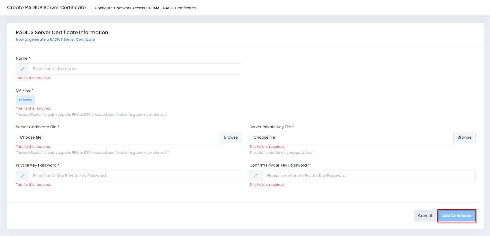 To add a custom certificate, select the RADIUS Server Certificate tab on the Certificates screen, then click on Add Certificate to open the following screen to define the certificate information: