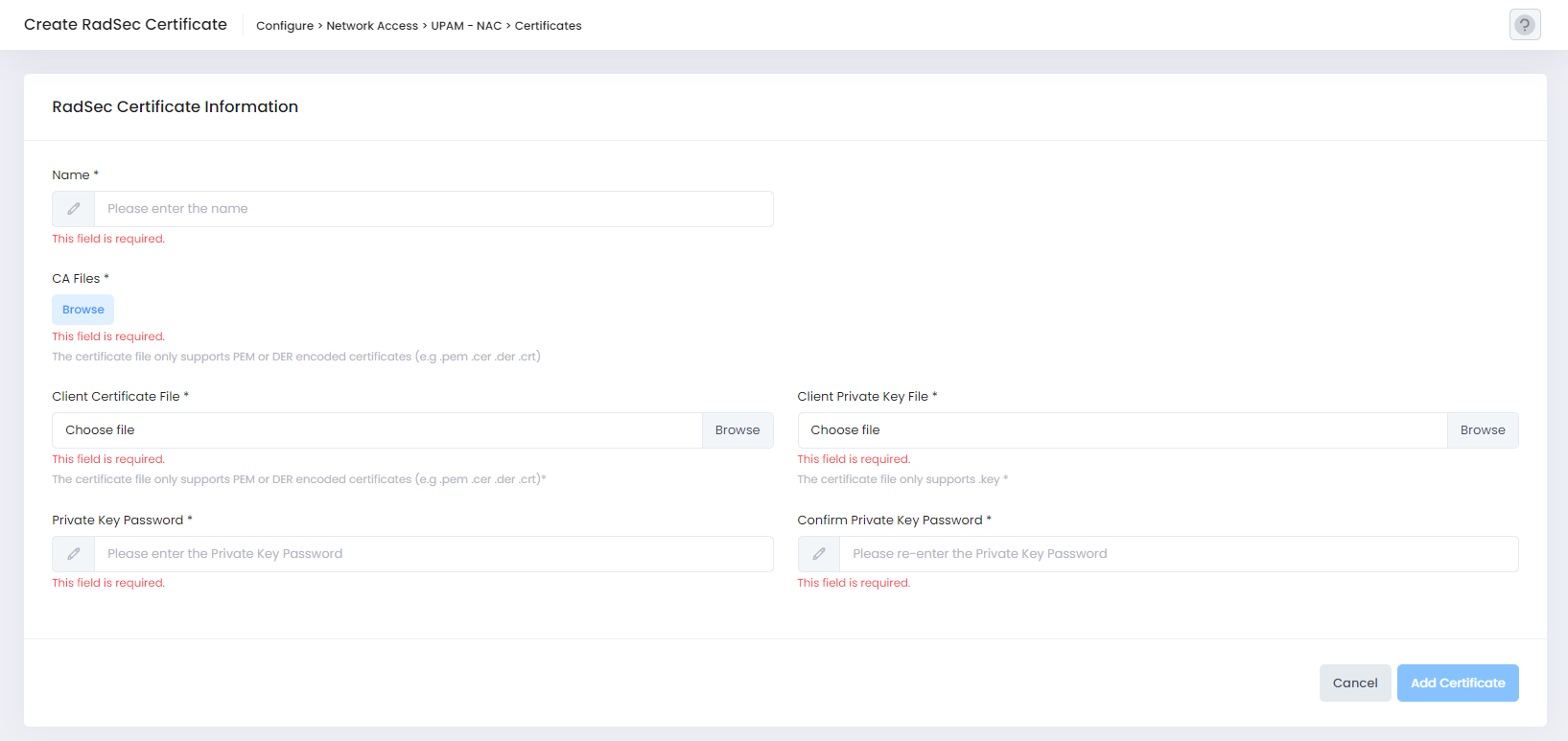 Select the RadSec Certificate tab on the Certificates screen, then click on Add Certificate to open the following screen to define the certificate information: