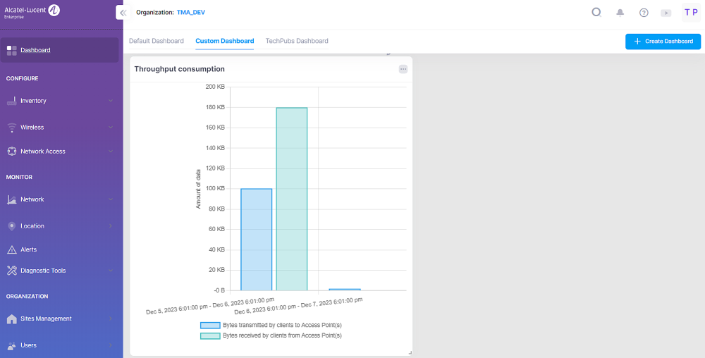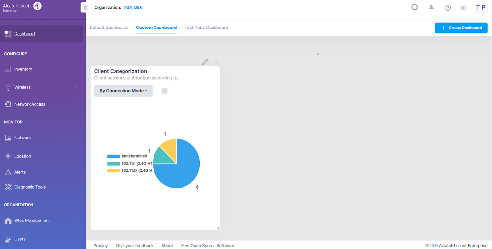 OmniVista Cirrus 10 provides focused dashboards to support common use-case and enables you to display a specific set of metrics and data points on one screen. You can use custom dashboards to view selected metrics and a relatively narrow or focused view of the data.