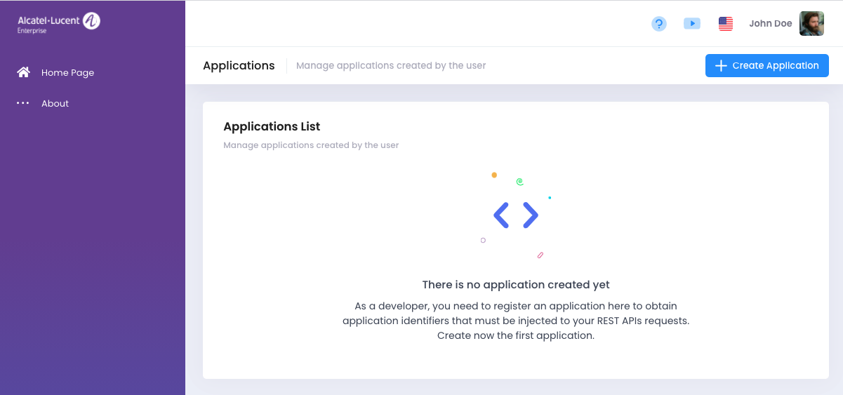 3. You are redirected to the Applications page. Click on the Create Application button: