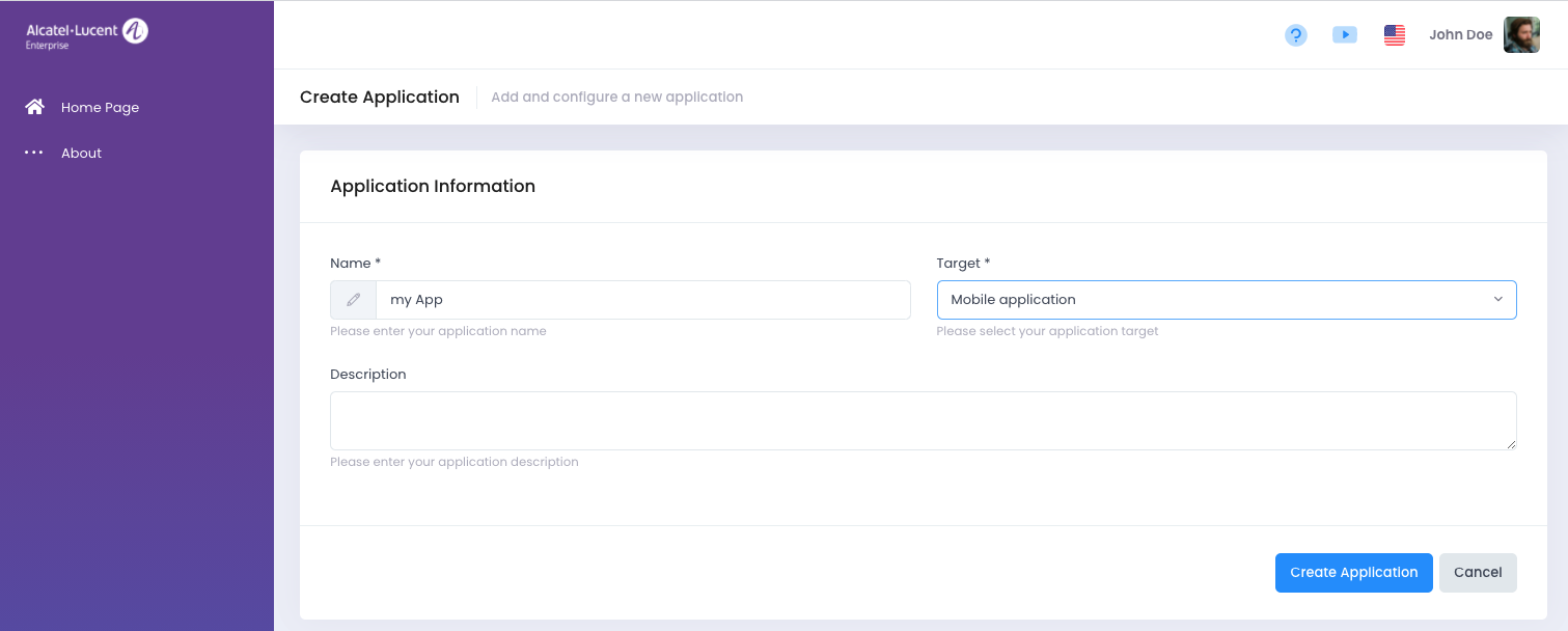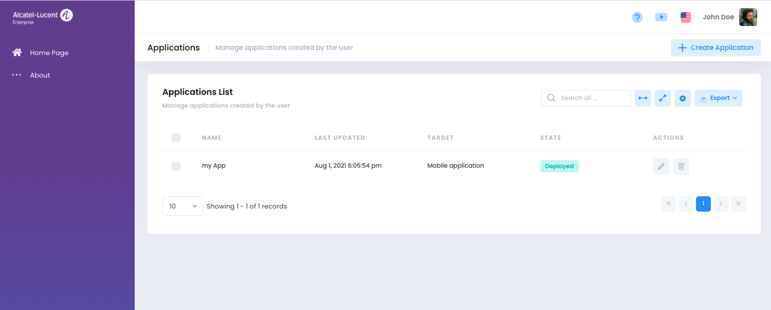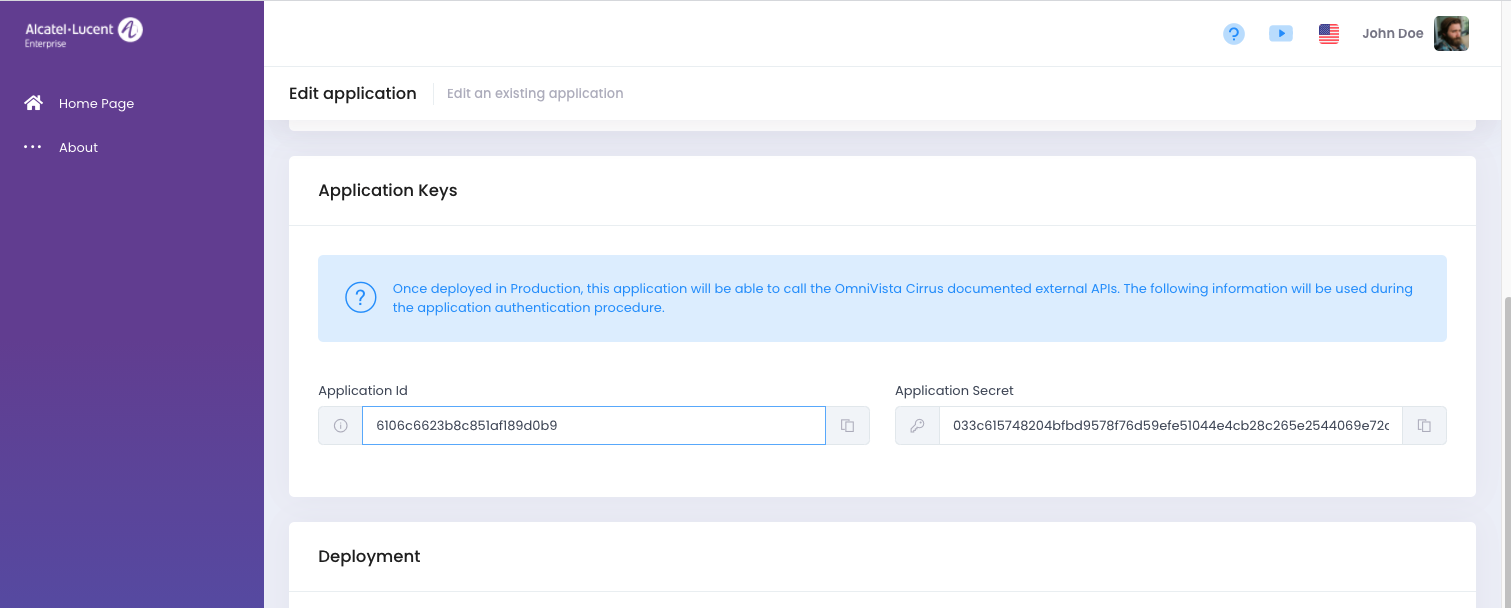 Tip: When a new application is created, its status is automatically set to Deployed. When an application is Deployed, it means that its API calls are authorized on the OmniVista solution with a couple of Application Id/Application Secret associated with this application. If you want to suspend for a time the usage of these identifiers, you can Un-deploy the application. The status will change to Undeployed and the usage of the Application Id/Application Secret identifiers will be suspended.