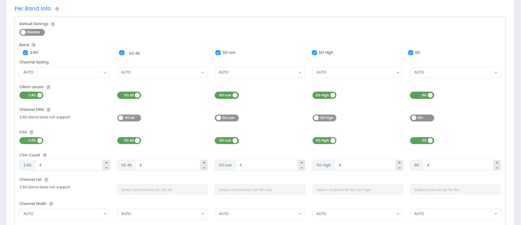 Per Band Info - Configures the wireless setting for each radio band on an AP, such as working channel, transmit power, and short guard interval of the radio.