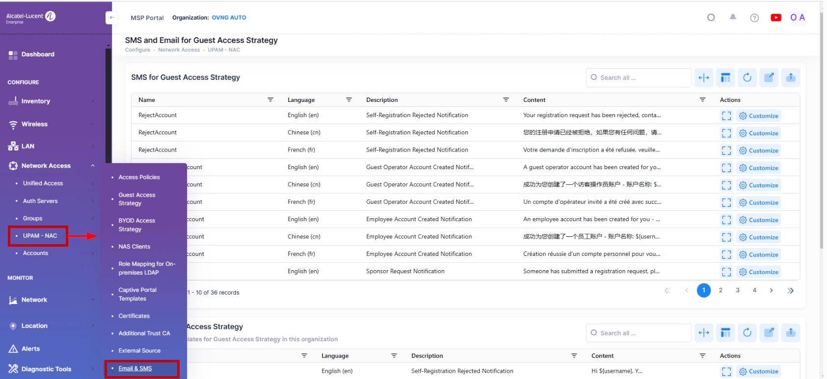 To access the SMS and Email for Guest Access Strategy screen, click on Network Access > UPAM-NAC > Email & SMS under the “Configure” section of OmniVista Cirrus Menu. You can use this screen to display the contents and customize the content of the templates.