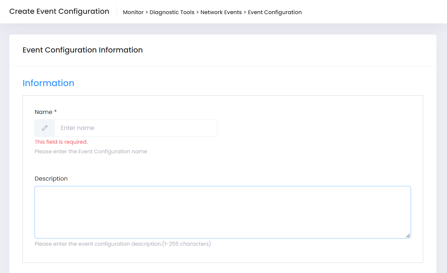 To access the Event Configuration screen, click on Diagnostic Tools > Network Events and select Profiles > Event Configuration tab under the “Monitor” section of the OmniVista Cirrus Menu.