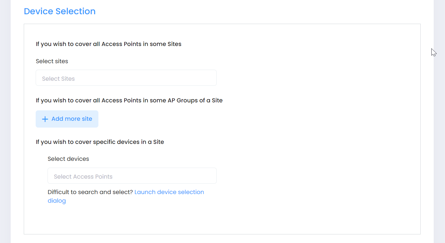 Select devices - Click on this field to display a list of devices. Select the device from the drop-down menu. Repeat this action for each device you want to select. To pick devices from a list of devices, click on “Launch device selection dialog”. A Device Selection window opens from which you can select devices.