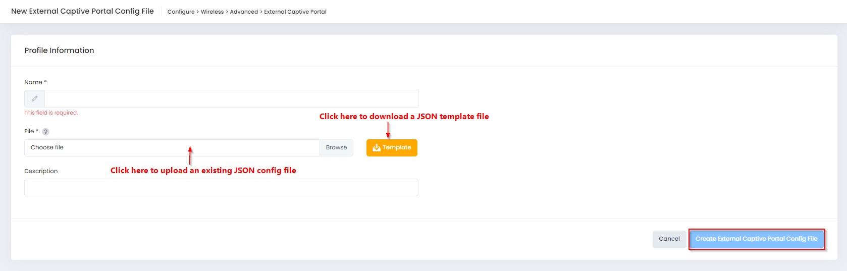 Template - You can click on Template to download a JSON template file that you can use to create an External Captive Portal Configuration file. Once you have completed and saved the external configuration file, click on Browse to locate and upload the file you created.