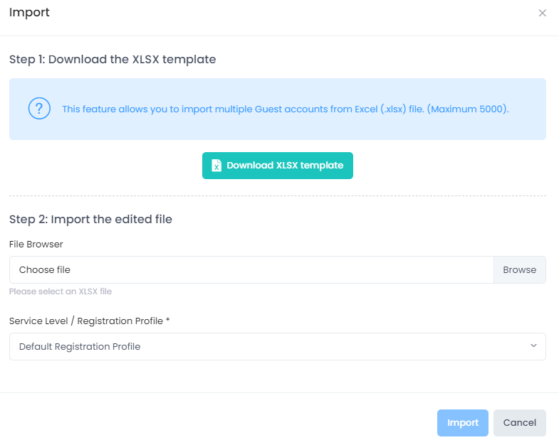 To import multiple Guest Accounts from an existing Excel sheet (.xlxs), click on Import from… and select XLSX template file. You will then be prompted to download an XLSX template file that contains steps on how to define the Guest Accounts in the Excel file to create multiple accounts.