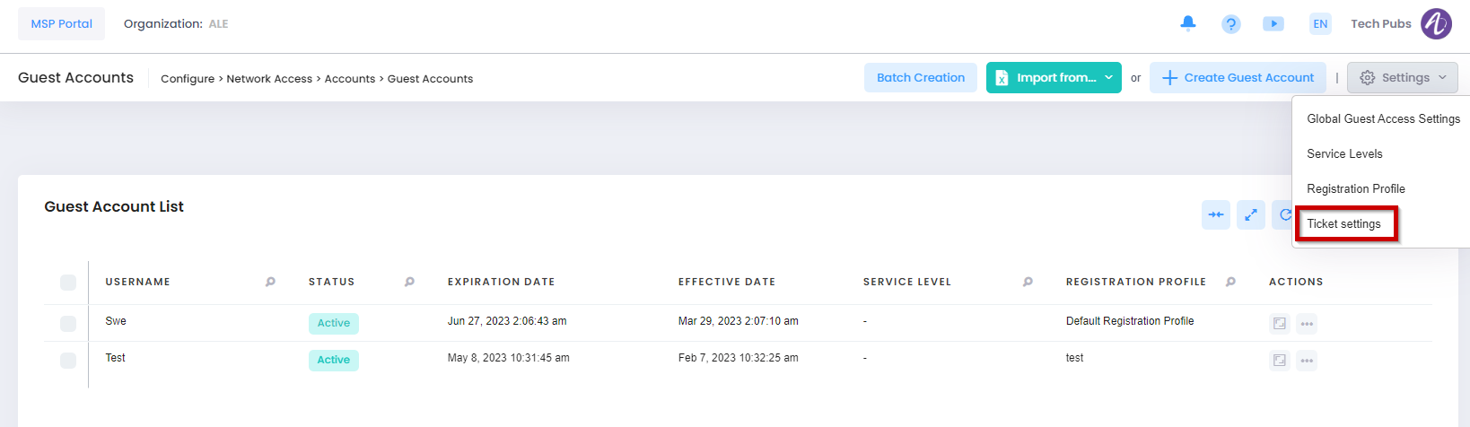 You can quickly create multiple Guest Accounts by clicking on the Batch Creation button at the top of the screen. If this button does not appear, the Batch Creation feature is not enabled. To enable this feature, click on the Settings button and select Global Guest Access Settings from the drop-down menu.