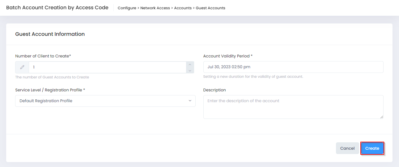 After you have finished with the field values, click on the Create button to create the Access Code for Guest Account.