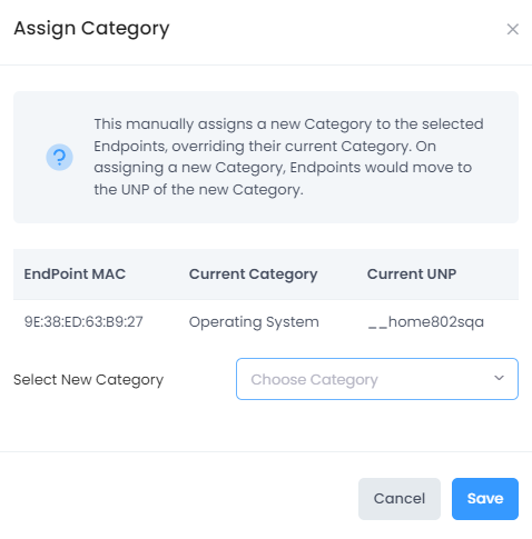 If Enforcement was configured for the assigned Category, endpoints might change their UNP mapping to the UNP that mapped with new category, or to no enforcement if the new category has no UNP mapping.