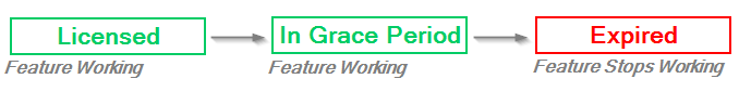 Note that some features may have a grace period (e.g., 30 days) and some features may not have a grace period. For example, the Upgrade feature might not have a grace period. If there is no grace period and the Upgrade feature license reaches its Expiry date, the feature goes directly into an “Expired” state and immediately reaches the “degraded” mode.