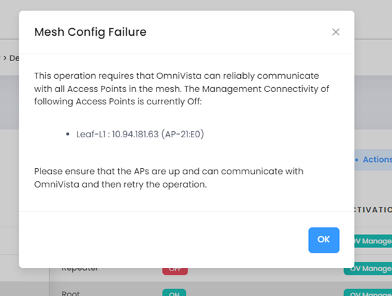 If the AP is not added to OmniVista Terra and is in Cluster Mode, connect to the default AP Wi-Fi or access Express UI to edit the mesh configuration for the cluster AP (Band, SSID, Passphrase) to be the same as the existing configured Mesh network in OmniVista Terra.
