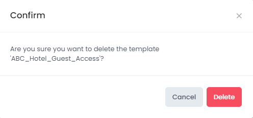 Select a template from the Captive Portal Templates list and click on the Delete icon under the “Actions” column or click on the Actions button and select Delete from the drop-down menu. When the following confirmation prompt appears, click on Delete to delete the profile.