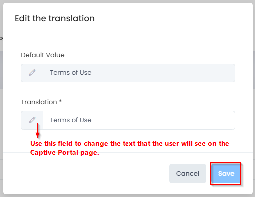 Change the text in the Translation field, as necessary. For example, if you selected the “Terms of Use” text object and changed the text in the Translation field to “Terms and Conditions”, the user would see “Terms and Conditions”. When you are done, click on Save to make the translation change for the selected text object.