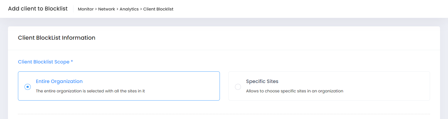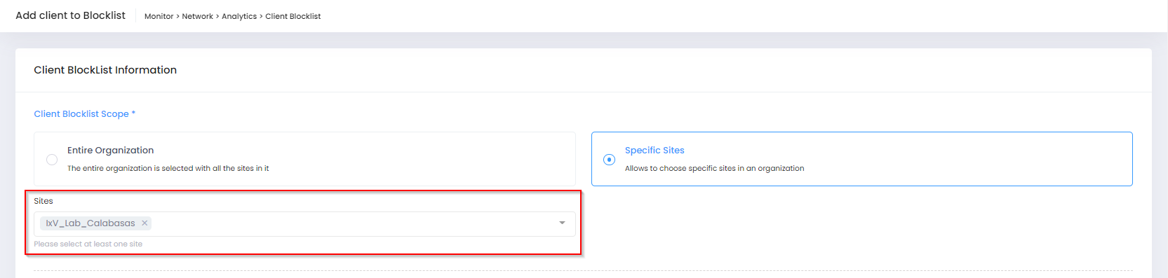 Specific Sites - Blocks client MAC address from selected Sites within the Organization.