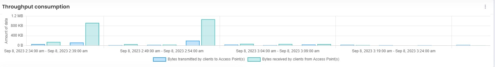 The Throughput Consumption section of the Client Analytics Dashboard includes a Bar Chart widget representing the number of bytes received and transmitted by Clients to Access Points over time.