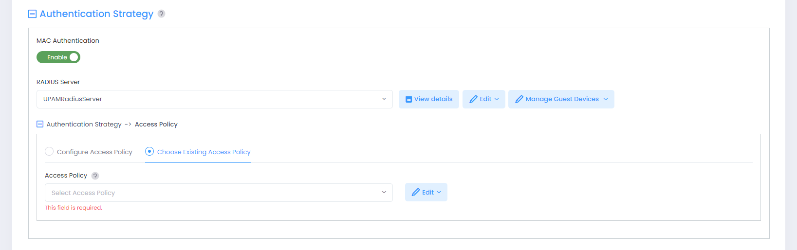 Authentication Strategy - Selects an authentication server, authentication strategy, and access policy.