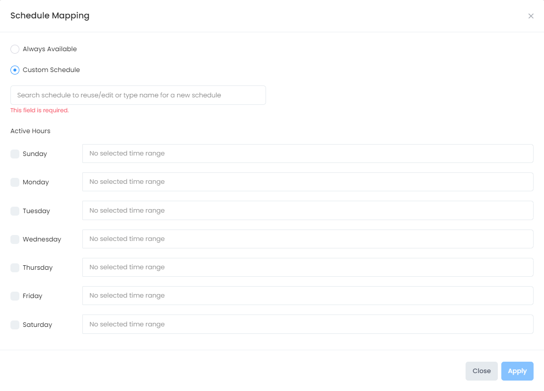 Custom Schedule - Define specific days/times during which the SSID network is available to clients.