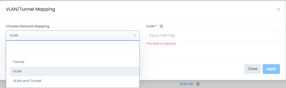 You can configure a VLAN/Tunnel mapping for all AP Groups across all Sites in the Organization, for all AP Groups associated with a specific Site, or for the selected AP Group.