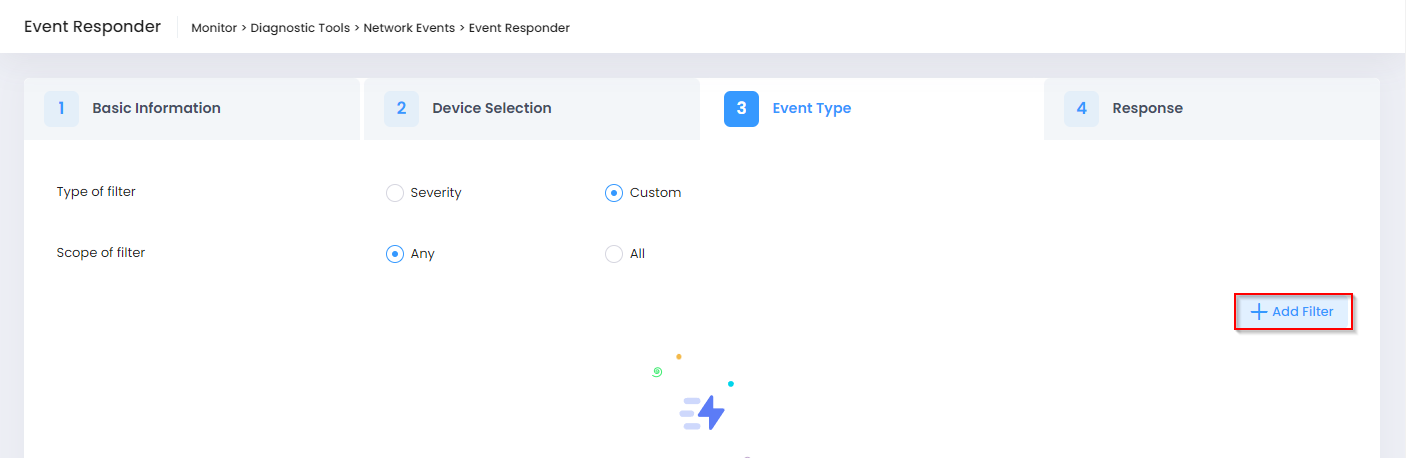 When you select Custom for the Type of Filter, the Event Type screen prompts you to select the scope of the filter and provides an Add Filter button to define a custom filter.
