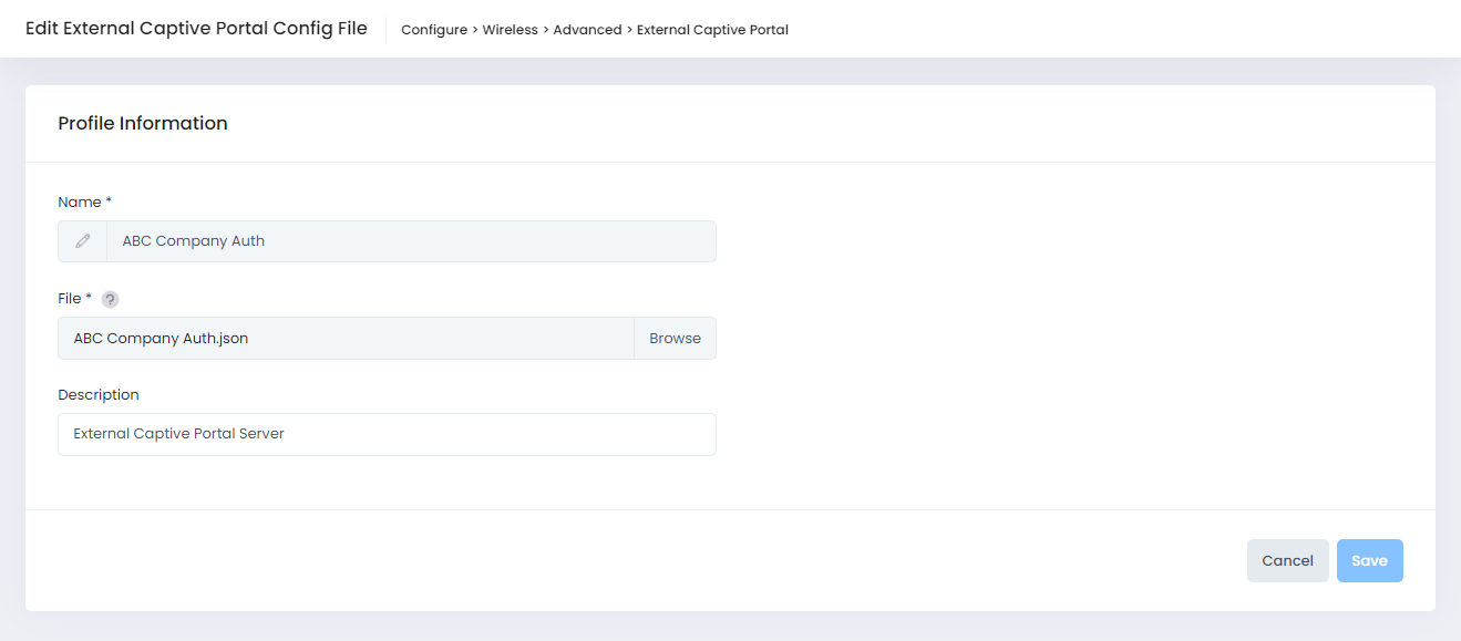 Template - You can click on Template to download a JSON template file that you can use to create an External Captive Portal Configuration file. Once you have completed and saved the external configuration file, click on Browse to locate and upload the file you created.