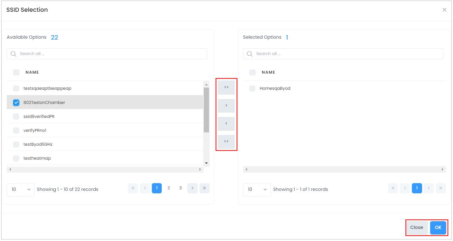 To add devices associated with an SSID to the Exception List, click on the Change Selection button to bring up the SSID Selection window. Select an SSID(s) and click on the Arrow button, then click on OK to add the SSID(s) to the Exception List. To remove an SSID(s) click on the Change Selection button to bring up the SSID Selection window. Select an SSID(s) and click on the Arrow button, then click on OK to remove the SSID(s) from the Exception List.