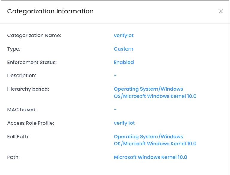 The IoT Enforcement feature enables you to authenticate devices by associating a Category with an Access Role Profile. Once a device accesses the network and is categorized, the assigned Access Role Profile is applied to the device. You can associate different Access Role Profiles with different categories; and you can enable automatic or manual enforcement Categories.